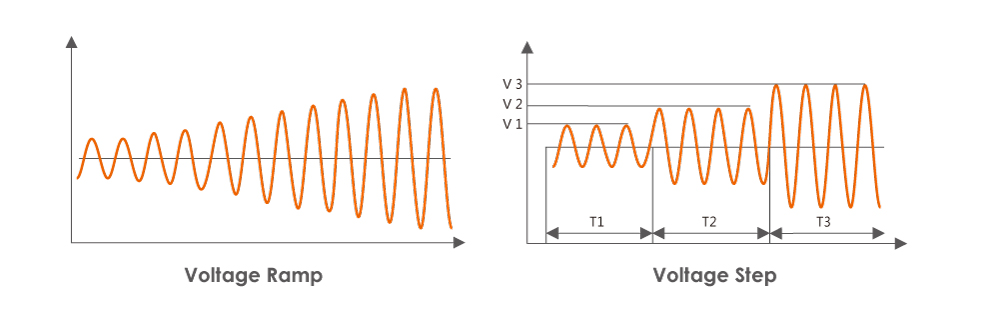 能分別設定24 組、12 組不同輸出電壓、輸出頻率及時間的步階與漸變記憶組,且可循環(huán)數百次。舉例來說,用戶可設定頻率45Hz逐漸增加到120Hz或電壓由0V逐漸增加到310V,模擬單一或連續(xù)的測試變化,以取代單純設置固定參數的測試方法;輕松完成復雜的測試程序,滿足各種負載輸入的特性。