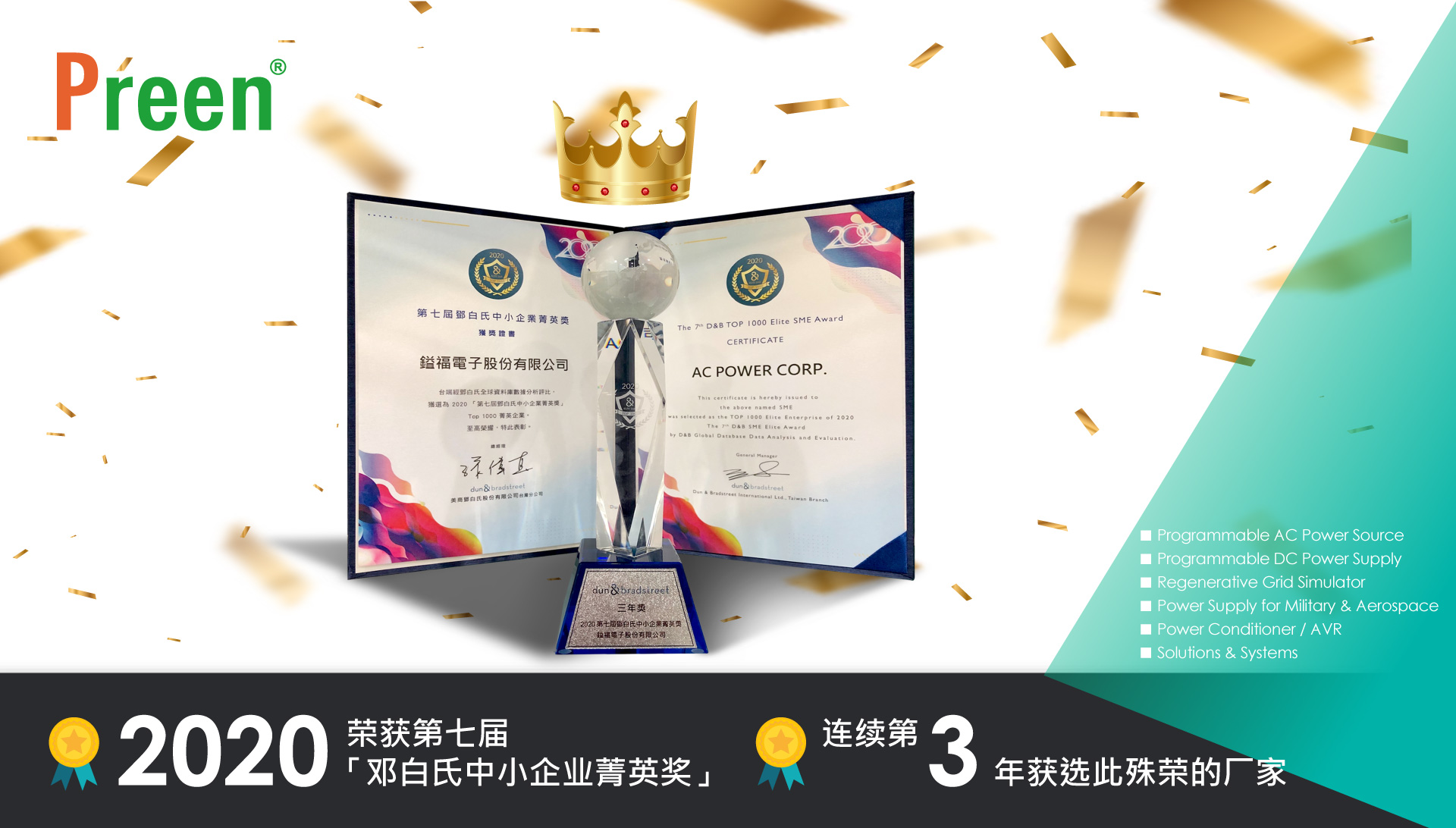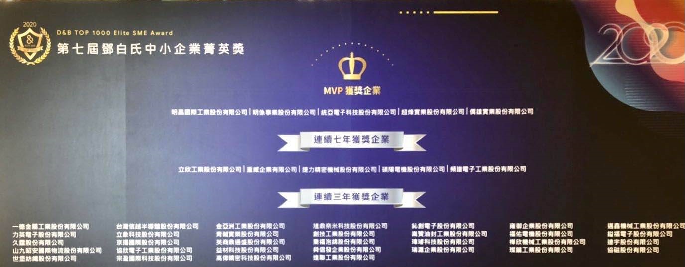 鄧白氏Dun & Bradstreet 中小企業菁英獎已成為臺灣中小企業年度盛事與經營追求指標,自2014年起舉辦至今已邁入第七屆,鄧白氏每年從國內超過146萬家中小企業中,運用數據分析評選出領先的出口競爭力的TOP 1000企業給予表揚。在2020今年共有1,068家入圍,我們不僅在競爭激烈的評選中脫穎而出、榮獲2020 第七屆「鄧白氏中小企業菁英獎」,更成為連續第三年獲選此殊榮的廠家之一。