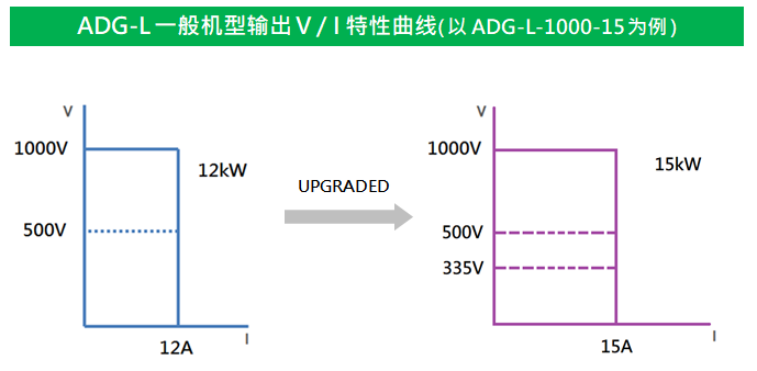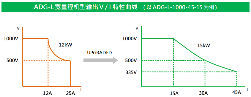 新一代 ADG-L系列的功率范圍與容量選擇擴充升級,具有三種輸出功率:5 kW、10 kW與15 kW、共計19款型號,取代上一代4 kW、8 kW與12 kW的14款型號,提供絕大多數負載所需之量測規格。其中更包含多個寬量程機型(Auto Range),相較于上一代的兩倍寬量程,新一代ADG-L系列,擁有三倍寬量程效果,可于較低壓輸出時,輸出較大的最大電流,提供客戶多元的選擇方案。